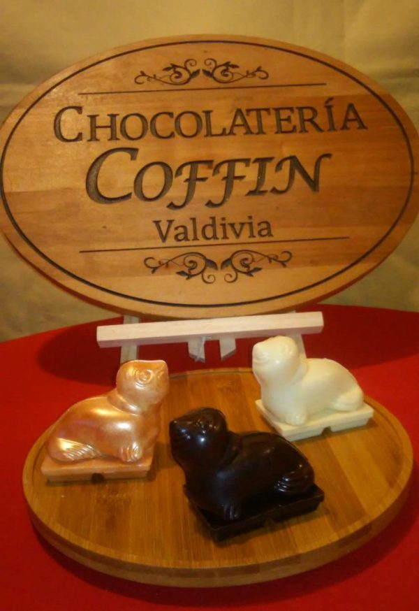 Souvenir Valdiviano. Variedades de chocolate café blanco, efecto envejecido.